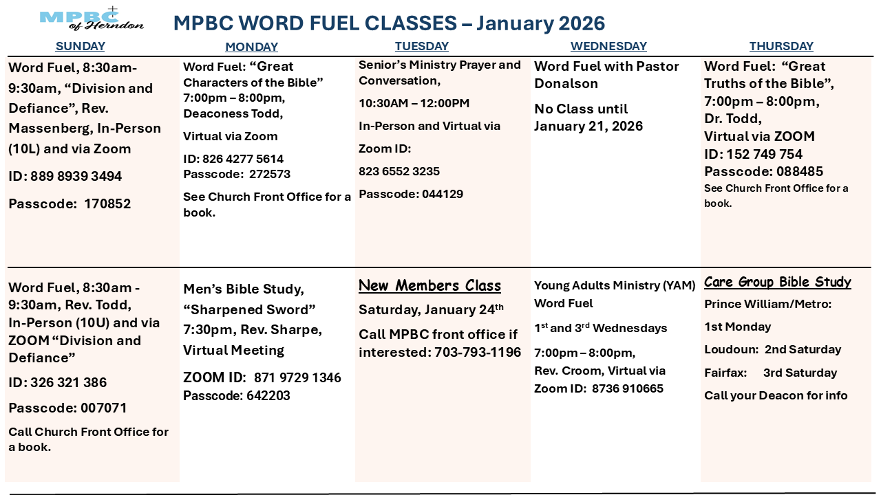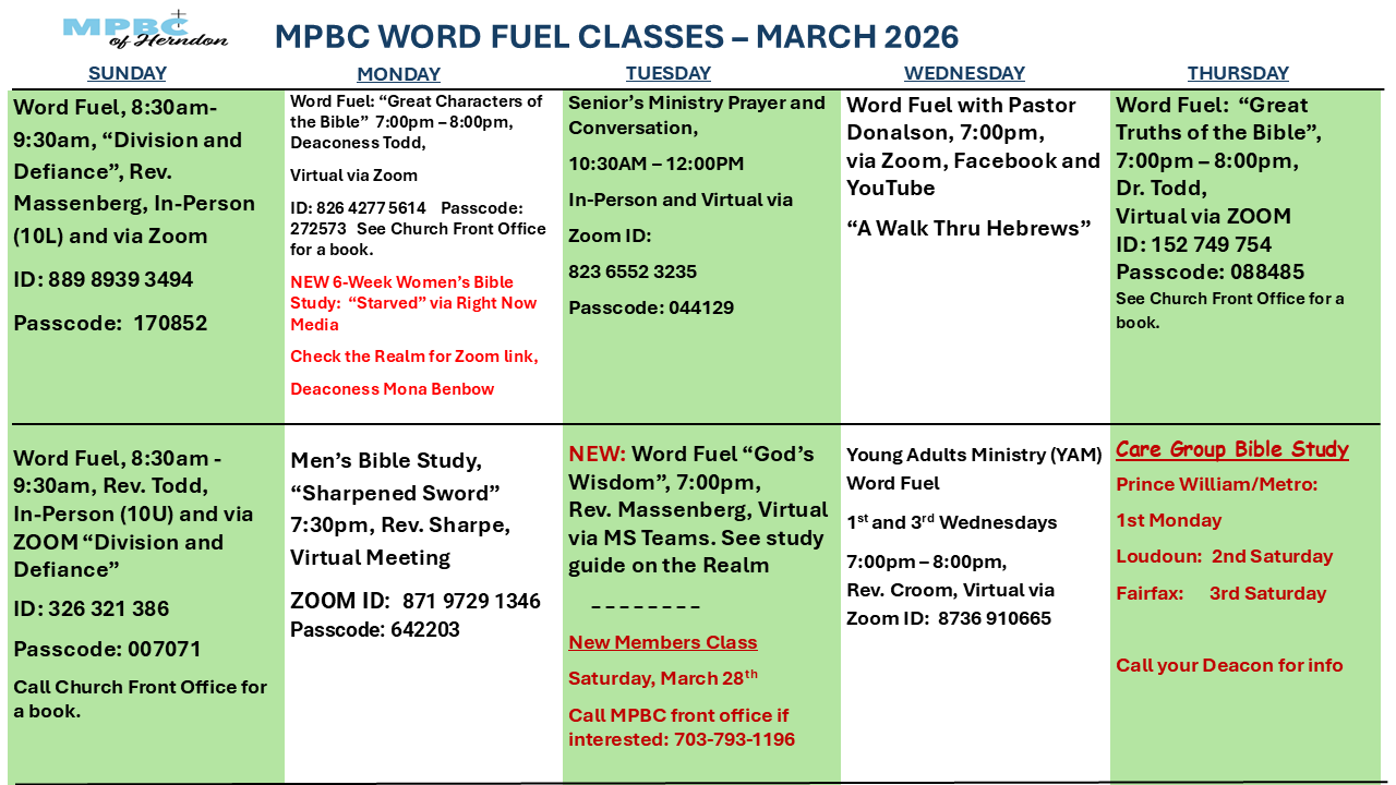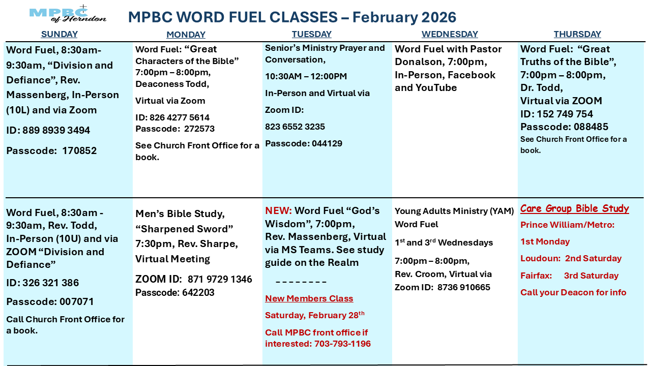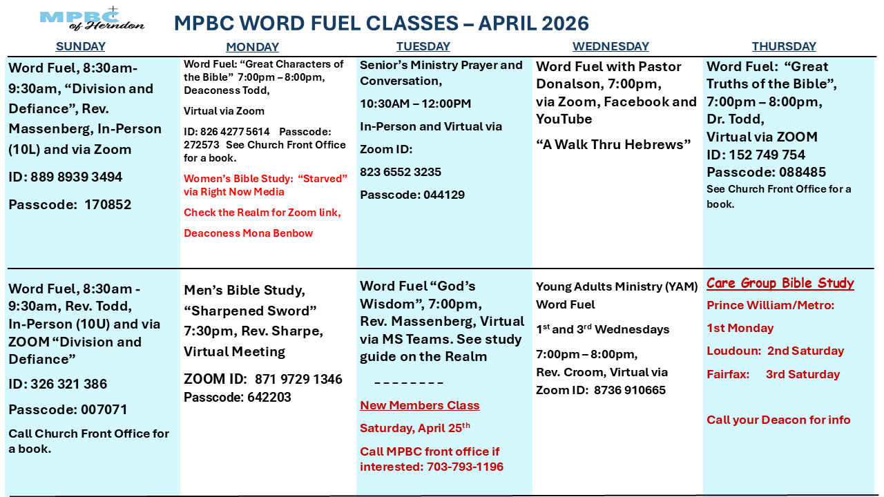 View the Schedule for In-person and Online Word Fuel (Bible Study) Classes