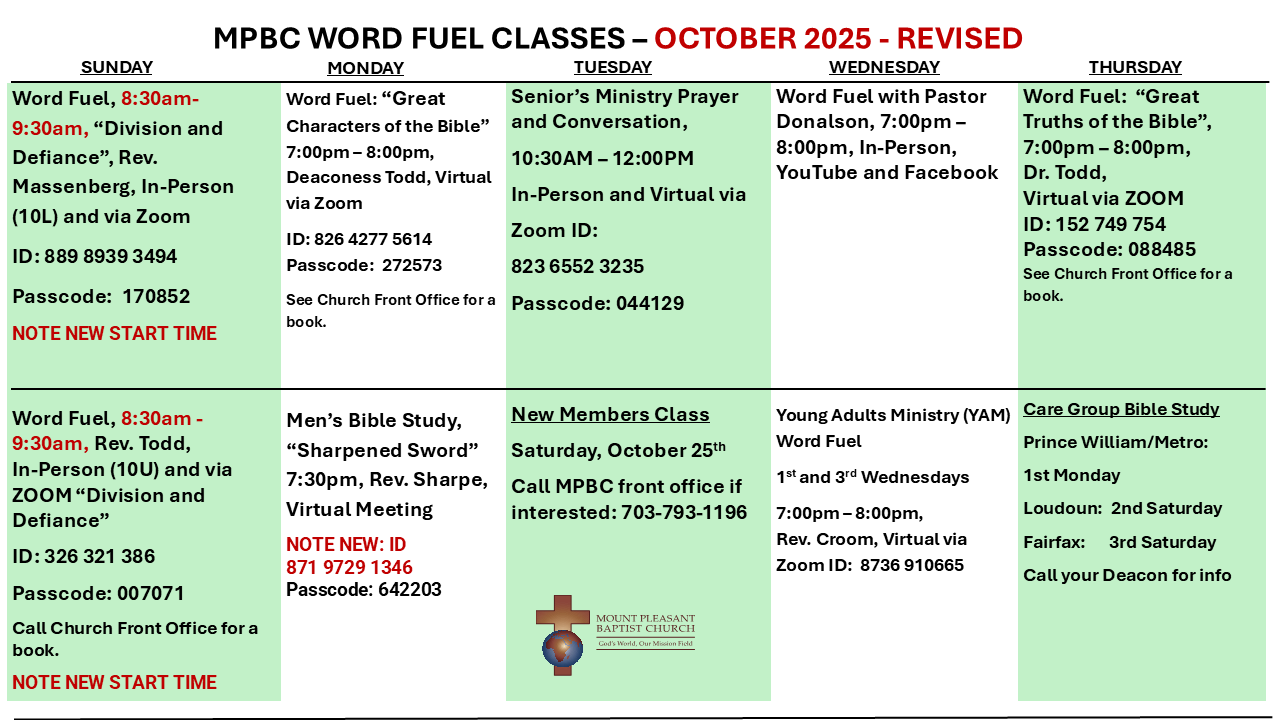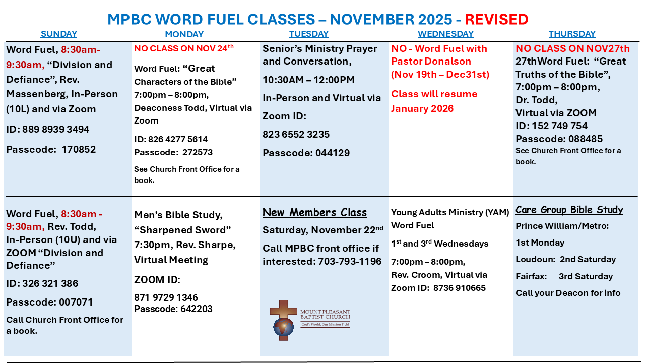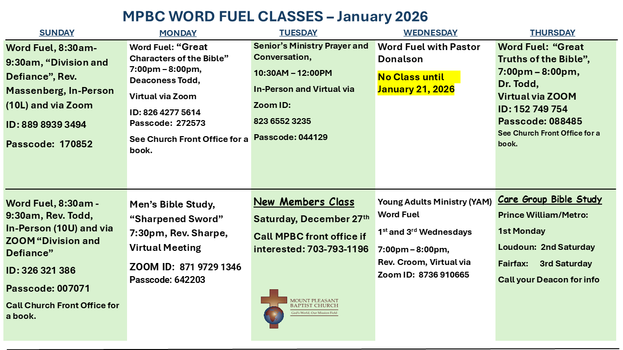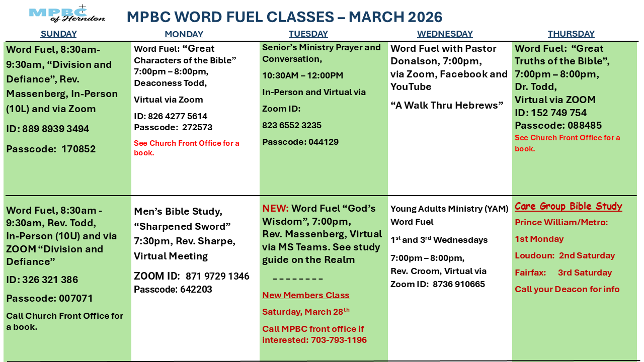 View the Schedule for In-person and Online Word Fuel (Bible Study) Classes